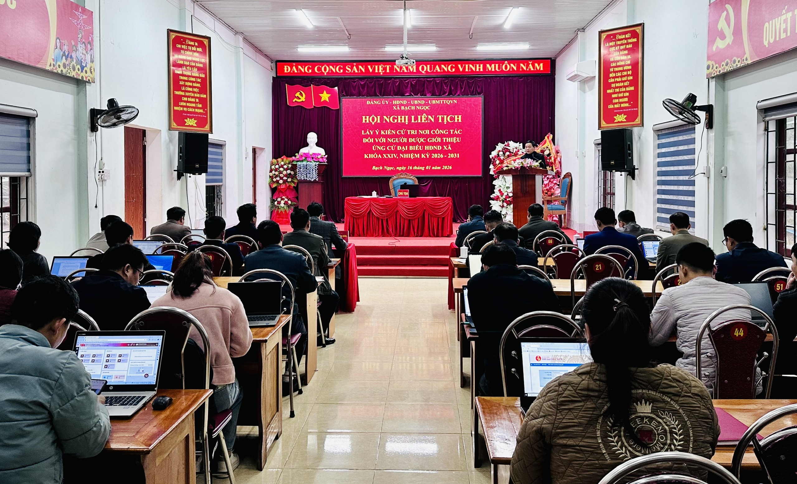 Ngày 16/01/2026, xã Bạch Ngọc tổ chức Hội nghị liên tịch lấy ý kiến cử tri nơi công tác đối với những người được giới thiệu ứng cử đại biểu Hội đồng nhân dân xã nhiệm kỳ 2026 – 2031. Đồng chí Giàng Văn Phùng – Phó Bí thư Thường trực Đảng ủy xã chủ trì hội nghị. Tham dự hội nghị có các đồng chí Thường trực Đảng ủy, HĐND, UBND, Ủy ban MTTQ xã cùng các đồng chí được giới thiệu ứng cử đại biểu HĐND xã.
